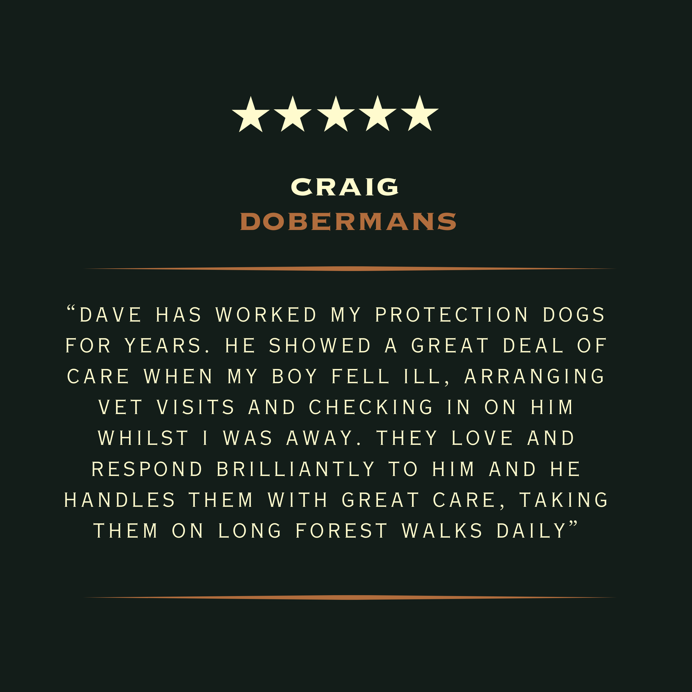 “I’ve trusted David with my beloved Doberman for over 4 years, he’s one of the few people he’s calm with and I wouldn’t be comfortable with him being walked by someone that can’t handle him physically as he can be reactive and a strong puller.”